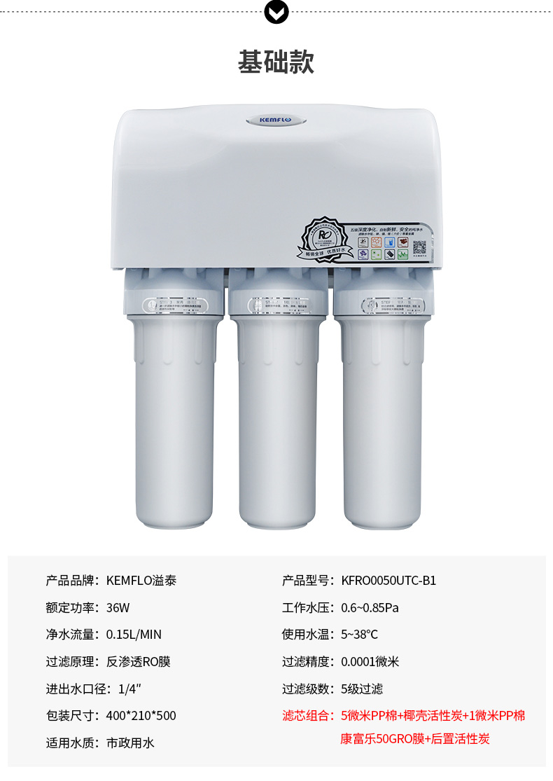 KEMFLO(康富乐)家用纯净水制造机产品特点: 1. 逆渗透装置再加上活性碳过滤系统,解决了几乎所有饮水的污染问题。 2.美国陶氏化学(DOW CHEMICAL)生产之逆渗透薄膜,可除去水中百分之99以上的杂质。 3.使用台湾东元超静音马达,耗电量低; 4.可产生高压…